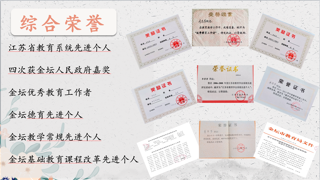 李老师致力于阅读与写作教学实践和研究。营造轻松的阅读氛围,为学生搭建快乐表达的舞台,创设阅读与表达互生共长的课堂。李老师先后评为江苏省教育系统先进个人、金坛市优秀教育工作者、金坛市“德育先进个人”等荣誉。