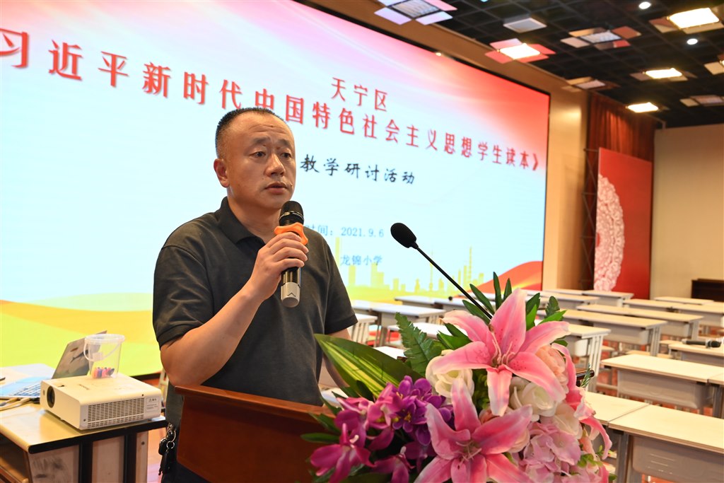 活动由天宁区小学道德与法治教研员唐剑老师主持,来自天宁区各小学道德与法治任课教师参加了本次研讨,天宁区教育局陶建平副局长、区教师发展中心史柏良主任、龙锦小学蒋瑛校长,以及李军玲副校长莅临会场。教学研讨活动分三个环节:关于《习近平新时代中国特色社会主义思想学生读本》的两节课例展示;教学研讨交流;陶建平副局长专题讲座。